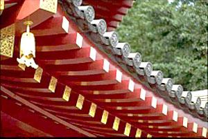 In the sixth century, the advent of Buddhism in Japan also brought the influence of more elaborate Chinese architectural style to its temples, including stone foundations, sturdy pillars to support lofty ceilings and decorative tiled roofs, all embellished with brilliant paint and other architectural detail. Therefore, by comparison, Buddhist temples are considerably more ornate than their austere Shinto counterparts.