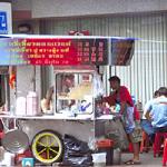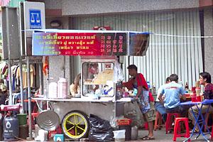 There are several places in Chiang Mai where stalls tend to congregate, especially after sundown. One is Sompet Market on Moon Muang Road Soi 6, which is particularly popular because it is near or between many nightspots and thus appeals to revelers with a case of the munchies. Another is near Chang Puak Gate on Maninopharat Road; it was this collection of stalls that caused me to coin the phrase rot dtit goo-ay tieo, or "noodle soup traffic jam", because so many cars park there at night that a bottleneck is created and people make sudden turns. At these places a bowl of noodles will generally run you 15 baht, although there are places that serve mini-bowls for, say, 8 baht; in the little southeastern town of Ban Chang where I used to live there was a bamboo restaurant that sold tiny bowls for 5.