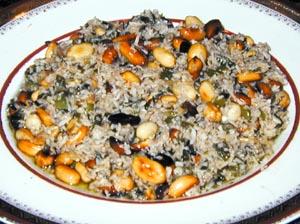 Heat oil in a frying pan, then fry peanuts over medium heat until they barely begin to brown. Remove peanuts from pan with a slotted spoon, then allow to cool. Reserve oil. Add to the to reserved oil in frying pan remaining ingredients, expect water, then stir fry for a few minutes. Add water, then cover and simmer over low heat for 40 minutes or until water is completely absorbed, stirring frequently. Stir in peanuts, then allow to cool before serving.