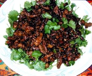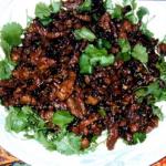Heat oil in a wok or heavy frying pan, then stir-fry lamb over medium/high heat for 4 minutes. Stir in remaing ingredients and continually stir-fry until lamb is cooked. Pour lamb with its sauce over coriander and serve immediately while still steaming hot.