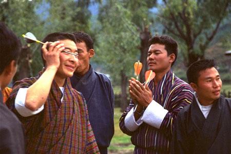 Khuru is a darts match and it's serious competitive sport in Bhutan. We happen upon a game in the town of Paro on our first evening, by which time the players are sufficiently in high spirits, with a little help from the local beer and rice wine. The targets are tiny bulls eyes the size of an orange and spaced 20 yards apart. Song, dance and a lot of heckling is all a part of the game.