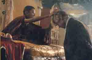 For the letter Ah, a search party was sent to Amdo in the northeastern province of Tibet, and then to the Karma Rolpai Dorje monastery in Kumbum, with its turquoise roof, for the letters Ka and Ma. There they found the house with the unusual gutters. A search of the surrounding villages revealed a house with an ancient juniper bush on the roof, where they sought lodging for the night. There they found an infant boy named Lhamo among the members of the household. The leader of the search party, pretending to be an ordinary servant, played with the child, who took to him instantly and called him Sera Lama, for the name of the monastery where the lama had once been a disciple. A few days later, the party returned with a collection of personal artifacts that had belonged to Thupten Gyatso, the former Dalai Lama, including rosaries, drums and walking sticks. When presented to the child along with other items that had not belonged to the Thirteenth Dalai Lama, the boy Lhamo claimed all the correct items as his own. Convinced that the child was the true reincarnation of the Dalai Lama, he was taken to Lhasa, but only after paying a substantial ransom to the Chinese provincial governor for his release.