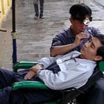 Nearby, on the sidewalk under a beach umbrella, another street barber had set up shop; it appeared that all his supplies-umbrella and its stand, a rather plush reclining chair, a stool, a mirror with an attached shelf, and a satchel containing supplies-had been transported to this location on the barber's bicycle. After strapping a battery operated light around his head, the barber, focussing with intensity, delved into his client's ear with a dangerous looking tubular device.