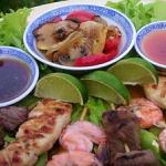 1/2 pound beef tenderloin, sliced into 1" pieces 12 large shrimp, cleaned and peeled, tails intact 2 boneless chicken breasts, sliced into 1" pieces 1/2 pound boneless pork loin, sliced into 1" pieces