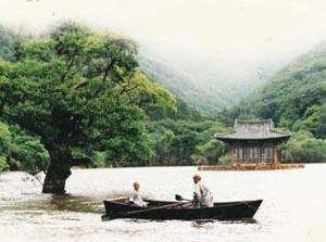 The supernal setting is a floating hermitage on Chusanji Lake in Mt. Chuwang National Park in the Republic of Korea's North Kyongsang Province, so isolated that it can only be reached by an ancient wooden rowboat, and so distant from the machinations of human civilization that only the diurnal path of the sun and the change of seasons mark the passage of time.