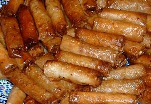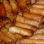 Place oil 1 to 2 inches deep in a saucepan, then heat. Fry rolls over medium heat, turning them over until they lightly evenly brown. Remove, then place in warm syrup for a few moments. Remove from syrup and allow to cool.