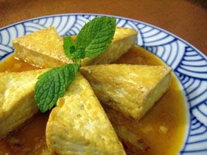 Cut the block of tofu in half to form two thinner slices. Place on layers of paper towel, cover with a baking sheet weighted with a heavy book. Allow to stand for 30 minutes to drain away the excess water. Cut it into 16 triangles. Heat the sesame oil in a wok and pan-fry the tofu triangles until golden brown on all sides. Remove from wok and drain on paper towels. In the same wok, add garlic, ginger and scallions and stir fry until just tender. Add fish sauce, lime juice sugar and chili garlic sauce and stir to blend. If the sauce is too thick or too strong, a little water may be added. Arrange tofu triangles on serving plates and drizzle the ginger sauce over them.