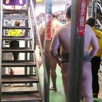 But, I thought, what the hell, this is my only chance to see Sumos. So I walked down there and pretended that I had a seat that I was walking to. I stepped back and stood along the wall. I wanted to get a good picture of the 5 or 6 Sumos lined up waiting to get to the ring like jets lined up in the sky at an overcrowded airport waiting to land.