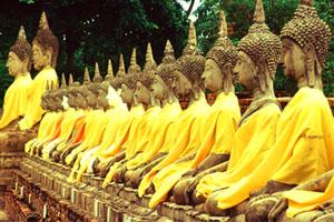 The Kings who ruled Ayutthaya constructed walls and fortresses as well as the moat that surrounded them, the remnants of which can still be glimpsed at certain points in the old part of the city. And of the hundreds of temples that were built, there is enough remaining of them today to enable you to imagine yourself back in Thailand's golden era of prosperity. If you close your eyes for a moment in the proximity of an ancient ruin it is not difficult to picture throngs of silken clad Thais in their national dress of baggy trousers cut off at the calf going about their business of the day. The city today is still surrounded by the three rivers (the Chao Phraya, Lop Buri and Pa Sak) and a good way to visit the city is to take the three and a half hour boat trip up the Chao Phraya from Bangkok, returning by road or train which is about an hour and a half trip.
