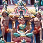 The five-tiered tower is crowded with figurative sculptures of gods, goddesses and beasts; on each side are various images of the goddess, flanked by her attendants. The bright shades used in the depictions are not chosen merely for decorative purposes, as colours have great significance in Hinduism. The deities are most often portrayed in colours that reflect their characters. For example, Lord Vishnu is usually in yellow, which represents knowledge and learning and Lord Krishna wears blue, which signifies bravery and manliness.