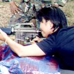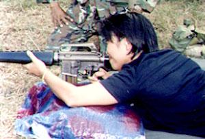 Shooting an M-16 is a powerful kick. As one young Australian man said, "It feels a bit like playing god. You can see what Chairman Mao meant when he said, 'Power comes from the barrel of a gun.'" At the same time, it was a bit frightening to realize how gunning someone down on the battlefield could be so easy and so impersonal. The paper target we were shooting at - meant to look like an enemy soldier - was about 20 metres away. I was reminded of a US Marine telling me in Bangkok how he'd shot two people crossing a river in El Salvador: "It wasn't like killing real people, man. Sad to say, but it felt like target practice."