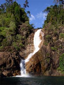 The polished blue sky was very soon whisked away by a carpet of stars. One by one the stars emerged from behind the unknown darkness, twinkle in its enigmatic way. Was it a teasing twinkle I saw? Or a twinkle of hope, of light? Big and small stars sprouting all over the night sky, enticing me to gaze up hopelessly. Whatever role each stars may have, they did not fail in adorning the night where I am, sitting on the rocks next to Berkelah's innermost waterfall - a 100 meters tall drop. The sound of cicadas partying at the verdure could hardly be heard, only a mild sound behind the powered down pour of the fall. Gushing water formed little droplets at the edge giving a cooling dampness on the skin with the help of the night jungle breeze. Besieged by such tranquility, I was in a state of reverie. What a wonderful night up here in the wilderness. Ah, one can just forget everything that concerns time. Be gone the toxic fumes of the city outrageous vehicles, be gone the mad rushing time of the corporate world, be gone the polluted air, be gone the headaches. The pungent smell of curry jolted me out from my reverie. Yes, dinner was ready! Evie's friends once again pampered us in the wild, feeding us delicious meal. Curry in the wild - sounds like a cool recipe name to me. Earlier this morning, 28 of us has traveled 3 hours along the Karak highway from Kuala Lumpur to get to our weekend gateway, the Berkelah Falls located in the Berkelah Forest Reserve area. In specific, it is between 46 km to 45 km from Kuantan town, Pahang. The signboard is clear from the main road to be missed. Camping junkies love to come here due to its easy accessibility and easy trek coupled with numerous nice camping sites scattered in between waterfalls. Cars are parked in front of the main road. We were transported overland by 4X4 vehicle through the mini-estates for 8 kilometers to reach the start-point of the trek. Alternatively, some people would prefer to follow the river trekking to meet up at the same point when the motorized tracks end to save up RM5.00 for the transport service. The concrete path paved the starting journey leading us the way in. It was a short path but hot as there were no big trees to shade off the heat. Soon reverting into a lateral trail after minutes of walk. Most of the trail stayed close to the river bank, providing less chances of getting mislead by wrong path. The trek along the way are lined with slippery big rocks most of the time giving the trekking experience a little thrill to be cautious or another choice to have a pre-shower before reaching the peak. Wet ropes appeared now and then helping to ease the climb. All the way to the peak was enhanced by scenic falls, soothing the eyes of any climbers. Baby falls were seen at the early stage, charming and inviting - somehow sending me a tinge of eagerness and excitement to see the last falls of Berkelah! The falls widen, becomes larger and more majestic as we moved a step nearer. One distinctive feature of all the waterfalls was the emerald color pool at the base! Perpetually clear, intensely remarkable ? undeniable worth to ogle at it! The vertical forces from the sudden down pour, deepens the pool naturally without much widening it. Three different levels of falls followed in a vertical line next. By then, I have lost count of the number of falls I had passed. Twin falls, split falls - they all are beautiful. After more than 90 minutes of slow, cautious trekking by the steep banks and all the ogling, the grand finale, Berkelah most prestigious waterfall pours its mantle before us. Standing 100 meters tall, it falls with energy to its pool making tiny droplets of water meters away at the edge where I stand - cooling the heat of the afternoon sun. We had set up our tent at the campsite earlier on, a two minutes walk from the grand finale. There was only one thing to be accomplished now. Jumped in and taste the fall! What a perfect thing to do on a Saturday afternoon, dipping in cool water besieged by tropical trees on both sides of the falls. Weekend outdoors has always been my favorite. I would certainly love to come back to this beauty in front of my eyes, waiting to be admired by anyone who loves nature. Even when disability might withhold outdoors activities, self-confidence, will power and simply a love to be with Mother Nature did not fail for one who is blind. The relished smiles curved on his face caught my eyes when he was dipping in the water enjoying his crunchy pear. He was certainly elated at that moment in the wilderness, after a journey of passing waterfall after waterfall.