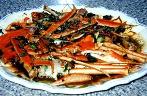 Heat a heavy frying pan or wok to piping hot, then add oil, garlic, chilli and ginger and stir-fry for 1 minute. Add crab legs, then stir-fry for a further 2 minutes. Stir in sauce and bring to boil, then cover and cook over high heat for 5 minutes. Stir in remaining ingredients, then serve with each diner partaking of the crab legs along with sauce.