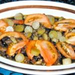 Heat oil, then fry meat over medium heat until meat begins to brown. Stir in remaining ingredients, except tomato and pickle, then bring to boil. Simmer for 30 minutes or until the meat is done, adding more water if necessary. Serve, with sauce, on a platter, garnished with tomatoes and cucumber pickle.