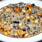 Heat oil in a frying pan, then fry peanuts over medium heat until they barely begin to brown. Remove peanuts from pan with a slotted spoon, then allow to cool. Reserve oil. Add to the to reserved oil in frying pan remaining ingredients, expect water, then stir fry for a few minutes. Add water, then cover and simmer over low heat for 40 minutes or until water is completely absorbed, stirring frequently. Stir in peanuts, then allow to cool before serving.