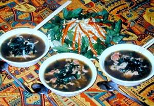 Season broth with Nuoc Mam and bring to boiling hot, then stir in green onions and coriander leaves. Pour over meat and noodles, then stir to cook meat. Serve with a large platter of bean sprouts, basil, peppers and lime, with each person adding greens from the platter to taste.