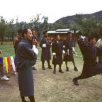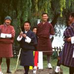 Khuru is a darts match and it's serious competitive sport in Bhutan. We happen upon a game in the town of Paro on our first evening, by which time the players are sufficiently in high spirits, with a little help from the local beer and rice wine. The targets are tiny bulls eyes the size of an orange and spaced 20 yards apart. Song, dance and a lot of heckling is all a part of the game.