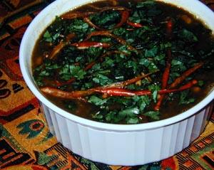 Roll out dough to about 1/8 inch thickness, then cut into 1 inch squares. Drop them into the lentils, then cook for a further 15 minutes over medium/low heat, stirring a few times and adding more water if necessary. Stir in lemon juice, then transfer into a serving bowl. Garnish with fresh chillis and coriander leaves, then serve hot.