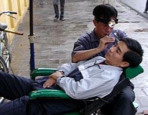 Amid the tumult of commerce, strolling vendors wend their way through the streets looking specifically for tourists. Typically hawking books, post cards, and T-shirts, they can be persistent in their pursuit of a sale, often dogging potential buyers' steps for blocks while endlessly imploring them to buy. The arguments they employ are only limited by their knowledge of English and range from the sublime to the desperate. "Buy from me and I will never forget you," promised a smiling girl with a bag full of T-shirts bearing the image of Ho Chi Minh. "Uncle Ho very good. First sale of the day. Bring me luck. I remember you forever. Make me lucky today." It was hard to refuse when so much was on the line.