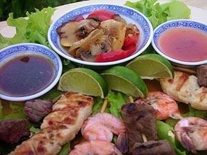 1/2 pound beef tenderloin, sliced into 1" pieces 12 large shrimp, cleaned and peeled, tails intact 2 boneless chicken breasts, sliced into 1" pieces 1/2 pound boneless pork loin, sliced into 1" pieces