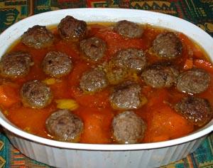 Arrange the eggplant pieces on the bottom of a casserole, then arrange evenly on top carrot rounds and slices of tomatoes in that order. Spread meatballs evenly between the tomato slices, then pour water mixture on top.