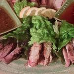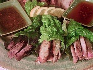 Using an outdoor grill, electric grill or a stovetop grill pan coated with non-stick cooking spray, grill on both sides, making sure that all meats, especially chicken and pork, are thoroughly done in the center, about 5 minutes per side. When the meat is done, remove from the grill and slice into 1/2" strips. Serve with a platter of red leaf lettuce. To eat, wrap the strips of meat in a lettuce leaf and dip in mild or spicy dipping sauces. Serves 4.
