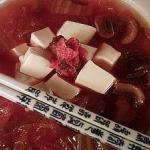 Place chicken stock and soy sauce in a large saucepan and bring to a boil. Add kimchi, mushrooms, scallions and ginger. Simmer for 20 minutes. Divide tofu cubes into four equal portions and place in the bottom of soup bowls. Ladle the soup over tofu and serve immediately. Serves 4.
