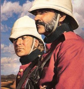 Throughout their arduous trek, Peachy and Daniel brave the perils of avalanches and Afghan marauders, over the lofty Himalayan peaks and down into the tribal valley of Kafiristan. According to Daniel Dravot's master plan, they will conquer and assimilate. "In any place where they fight," he says, "a man who knows how to drill men can always be a King. We shall go to those parts and say to any King we find - "D'you want to vanquish your foes?' and we will show him how to drill men; for that we know better than anything else. Then we will subvert that King and seize his Throne and establish a Dynasty." And in a later scene, he explains to one rag-tag band of would-be soldiers, "Now listen to me you benighted muckers. We're going to teach you soldiering. The world's noblest profession. When we're done with you, you'll be able to slaughter your enemies like civilized men."