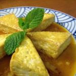 Cut the block of tofu in half to form two thinner slices. Place on layers of paper towel, cover with a baking sheet weighted with a heavy book. Allow to stand for 30 minutes to drain away the excess water. Cut it into 16 triangles. Heat the sesame oil in a wok and pan-fry the tofu triangles until golden brown on all sides. Remove from wok and drain on paper towels. In the same wok, add garlic, ginger and scallions and stir fry until just tender. Add fish sauce, lime juice sugar and chili garlic sauce and stir to blend. If the sauce is too thick or too strong, a little water may be added. Arrange tofu triangles on serving plates and drizzle the ginger sauce over them.