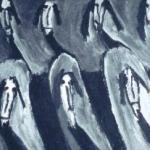 The stick figures are warped and elongated - stretched out of proportion - and the arms and legs look like long and smooth bones. Each figure tilts and twists at painful angles. They bring to mind the famous harrowing faces in Edward Munch's The Scream, or the difficult distorted ones from the portraits of Francis Bacon. But most of the faces Y Nhi paints are miniature ones devoid of details. And they are in black and white.
