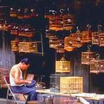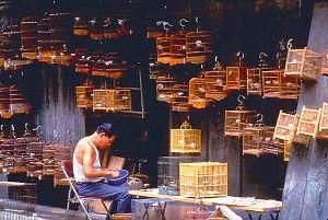It was early in the morning and the sidewalks along Nathan Road near Kowloon Park were temporarily not crowded. An elderly bird walker shuffled along, occasionally puffing on a nicotine-stained cigarette holder. He carried two birdcages, one hanging from the other. The birds offered tentative chirps as the cages swayed with the man's rhythm. When viewed against the backdrop of computers, video cameras and other electronic gadgetry in the windows, the reflection of the birdwalker created a brief allegorical montage.
