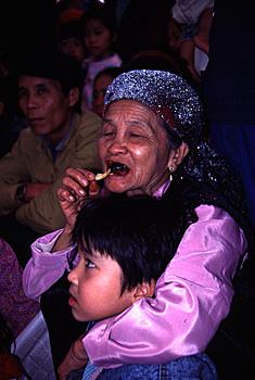 Mrs. Nguyen Thi Pham, a 67 year old Hanoian, dressed in a loose silk overblouse, black satin trousers, jade bracelet and necklace, described the ritual blackening of her teeth when she was 17. Pham waves her slender gold-ringed fingers as she described the party-like atmosphere of the ceremony. Her grandmother blackened her teeth as the rest of her family looked on joking and making joyful comments to her as her mouth was being "painted." There needed to be three applications (every other day for a week) because natural saliva washed off the original application of chemicals. For that period of time she could not eat solids and could drink only through a straw. The ritual certified that she was "grown up and ready for marriage." Although it was not a painful process for Pham, I have spoken to other women who recall that their mouths swelled up or that their gums burned and stung for days. The procedure could take place some time after the age of ten when the child has all her permanent teeth but is usually done after menarche.