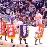 I arrived at the arena around 1:30 in time to watch some of the lower matches. Around 3 pm the higher ranked Sumos all paraded out and formed a circle on the stage dressed in their fighting outfits covered with a kind of colorful apron. Then they came out one from the east and one from the west and started to fight. By this time the arena started to fill up and the excitement was building. There was live TV coverage. The higher ranked referees came out. They were dressed in beautiful kimonos of the style of the Edo period (1600-1867).