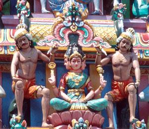 The five-tiered tower is crowded with figurative sculptures of gods, goddesses and beasts; on each side are various images of the goddess, flanked by her attendants. The bright shades used in the depictions are not chosen merely for decorative purposes, as colours have great significance in Hinduism. The deities are most often portrayed in colours that reflect their characters. For example, Lord Vishnu is usually in yellow, which represents knowledge and learning and Lord Krishna wears blue, which signifies bravery and manliness.